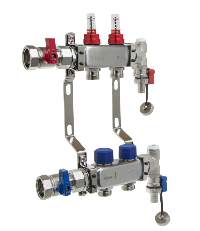 2 port stainless steel manifold comes with flow meter, isolation valves, drain off and manual air vents 276W x 320H x 90D