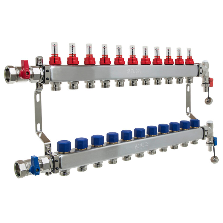 11 port stainless steel manifold comes with flow meter, isolation valves, drain off and manual air vents 726W x 320H x 90mmD