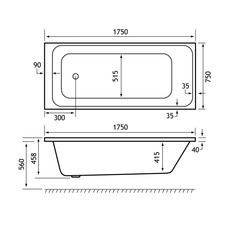 - Length: 1750mm, Width: 750mm, Internal depth: 440mm, Height: 560mm