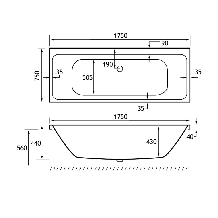 - Length: 1750mm, Width: 750mm, Internal depth: 440mm, Height: 560mm