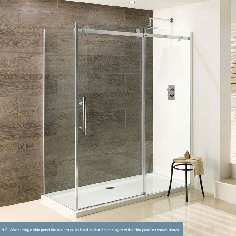 A luxurious, easy to clean enclosure with a distinctive top roller mechanism making a bold statement in your bathroom. In 10mm tempered safety glass with easy clean finish. Comes with 10 year manufacturers guarantee, with a range of trays to match. Runners release for ease of cleaning, extension profile availabe if required.