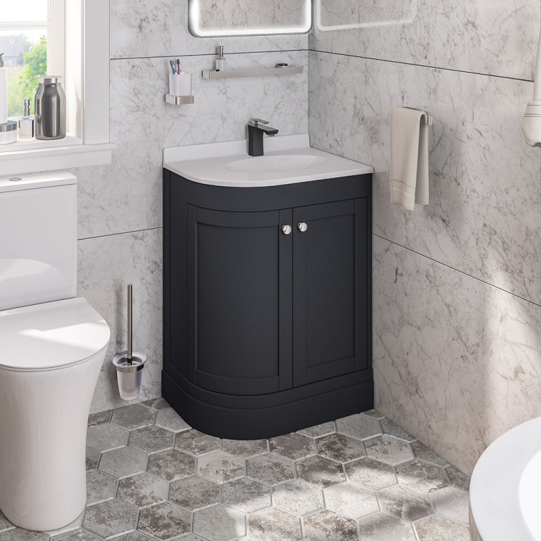 The Hardwick bathroom furniture features a luxurious basin design that flows seamlessly with the traditionally inspired curved lines and door panels of the vanity unit.