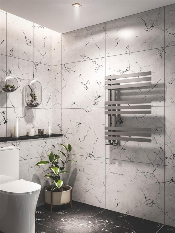 A modern, versatile designer towel rail. Available in 6 colours with reversible installation possibility.