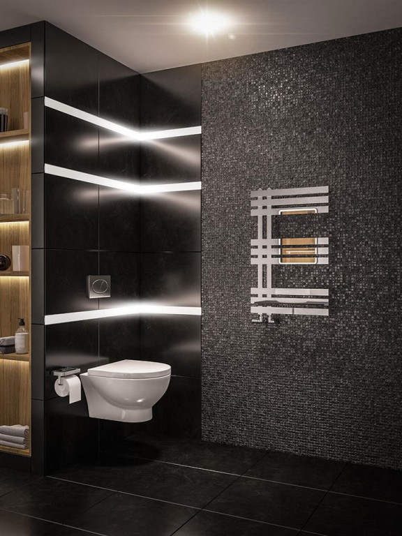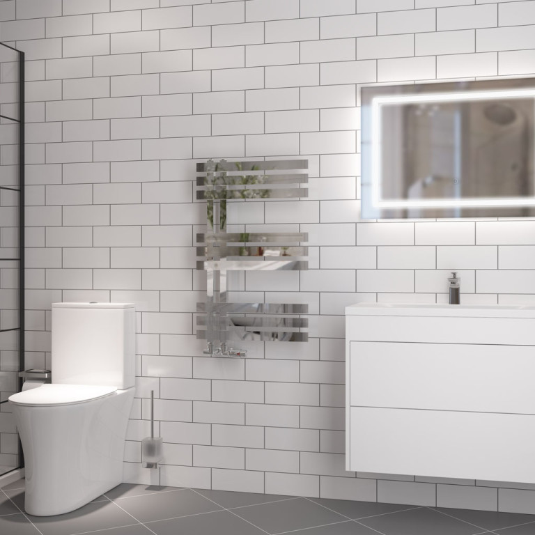 A modern, versatile designer towel rail. Available in 6 colours with reversible installation possibility.