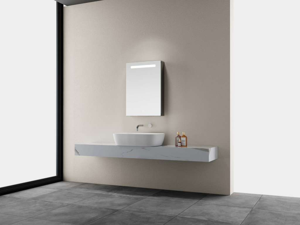 - Right-hand hinged door opening / Soft-close hinges / 3-tone ambient lighting / Door mirrored on the reverse.
