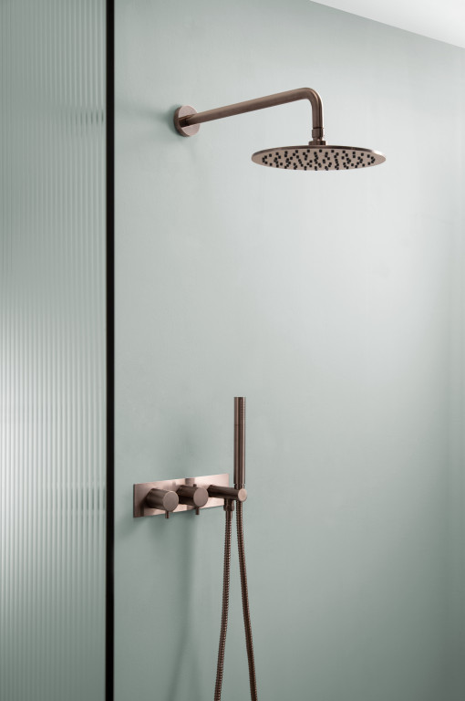 Vos Shower Combination - 2 Outlet Concealed Thermostatic Shower Valve with 3 Controls, Overhead Shower and Extractable Hand Shower - Brushed Bronze