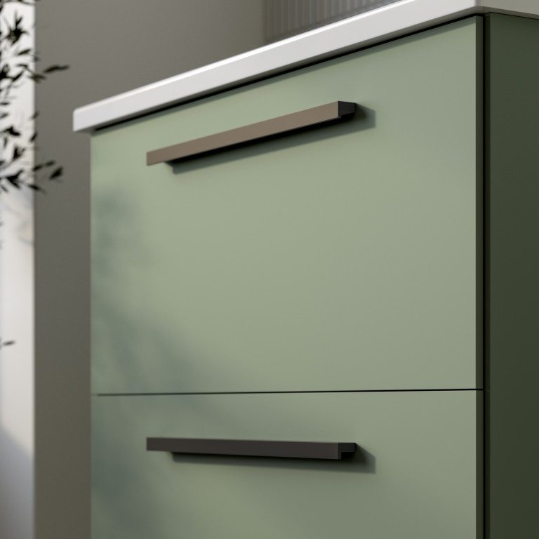 Berwick is a versatile and stylish bathroom vanity that seamlessly blends aesthetics with functionality. Its design is characterised by sleek angled edges, a modern slim bar handle and a made-to-fit, white ceramic basin. The two large, smooth glide drawers, provide practical and convenient storage for towels, toiletries, and other bathroom essentials.