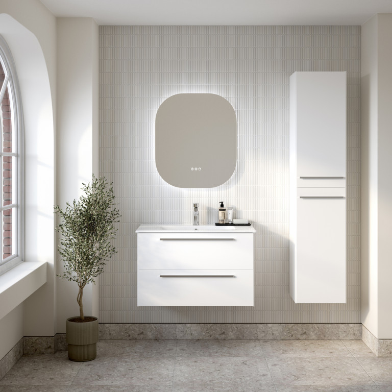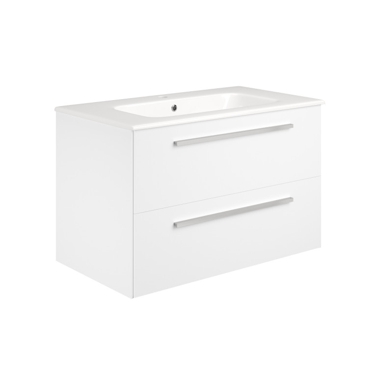 Berwick is a versatile and stylish bathroom vanity that seamlessly blends aesthetics with functionality. Its design is characterised by sleek angled edges, a modern slim bar handle and a made-to-fit, white ceramic basin. The two large, smooth glide drawers, provide practical and convenient storage for towels, toiletries, and other bathroom essentials.