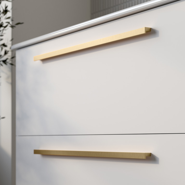 - Modern Levin slim bar handles in Brushed Brass.