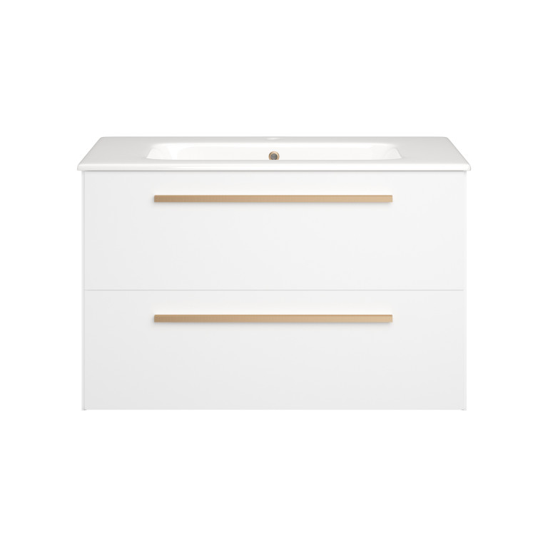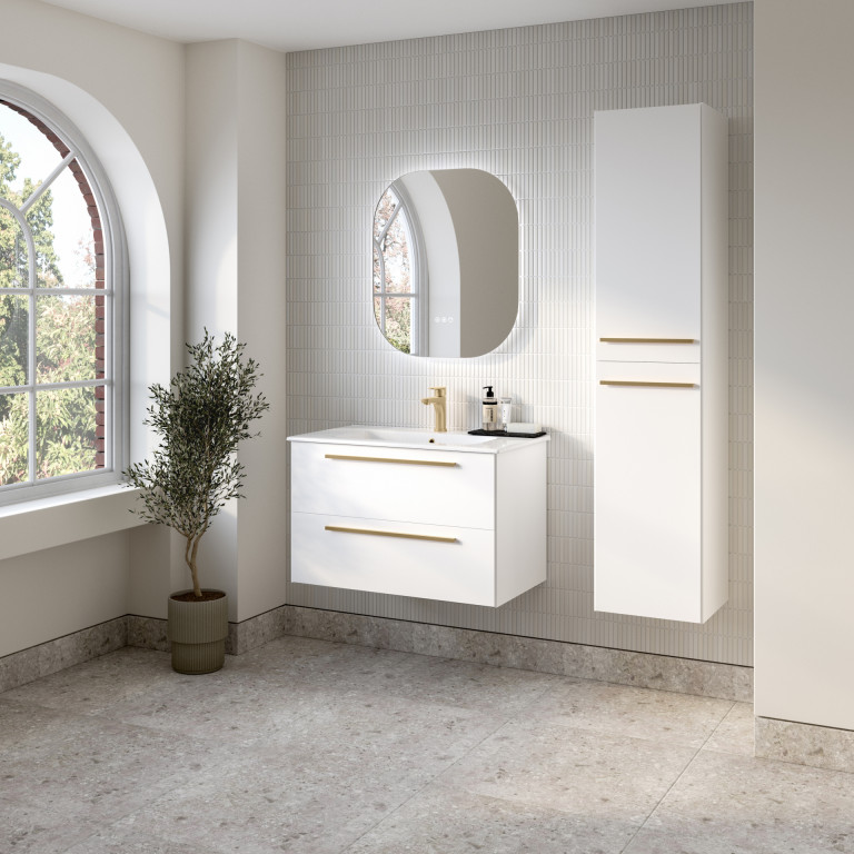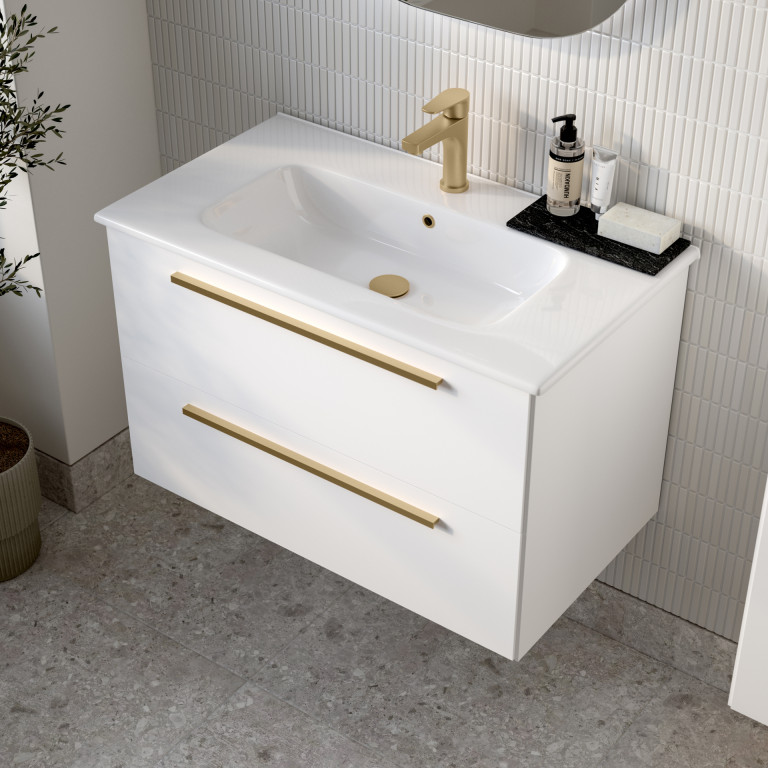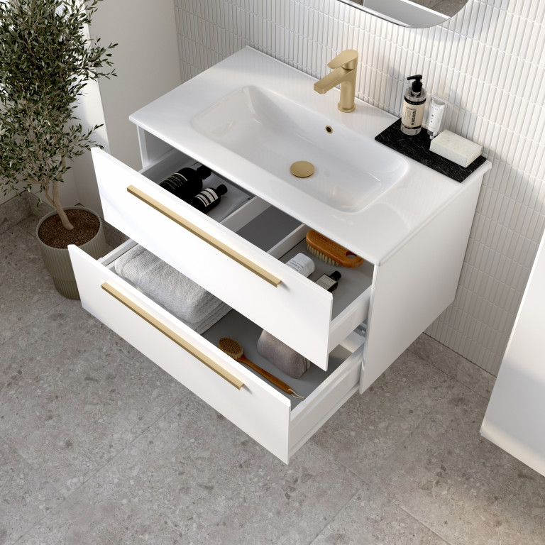 Berwick is a versatile and stylish bathroom vanity that seamlessly blends aesthetics with functionality. Its design is characterised by sleek angled edges, a modern slim bar handle and a made-to-fit, white ceramic basin. The two large, smooth glide drawers, provide practical and convenient storage for towels, toiletries, and other bathroom essentials.
