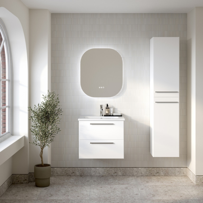 The Berwick wall unit is a versatile and stylish companion to the Berwick vanity unit. Its design is characterised by sleek angled edges, a modern slim bar handle and two doors revealing one fixed central shelf and 3 glass shelves.