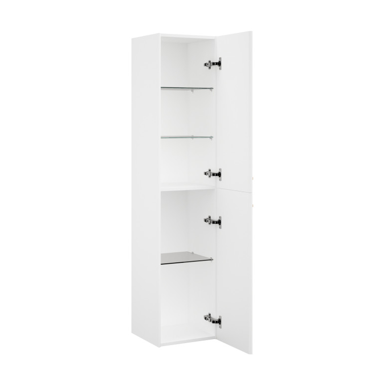 The Berwick wall unit is a versatile and stylish companion to the Berwick vanity unit. Its design is characterised by sleek angled edges, a modern slim bar handle and two doors revealing one fixed central shelf and 3 glass shelves.