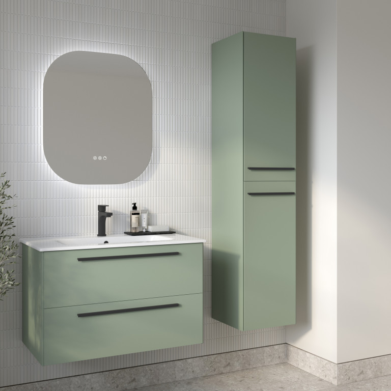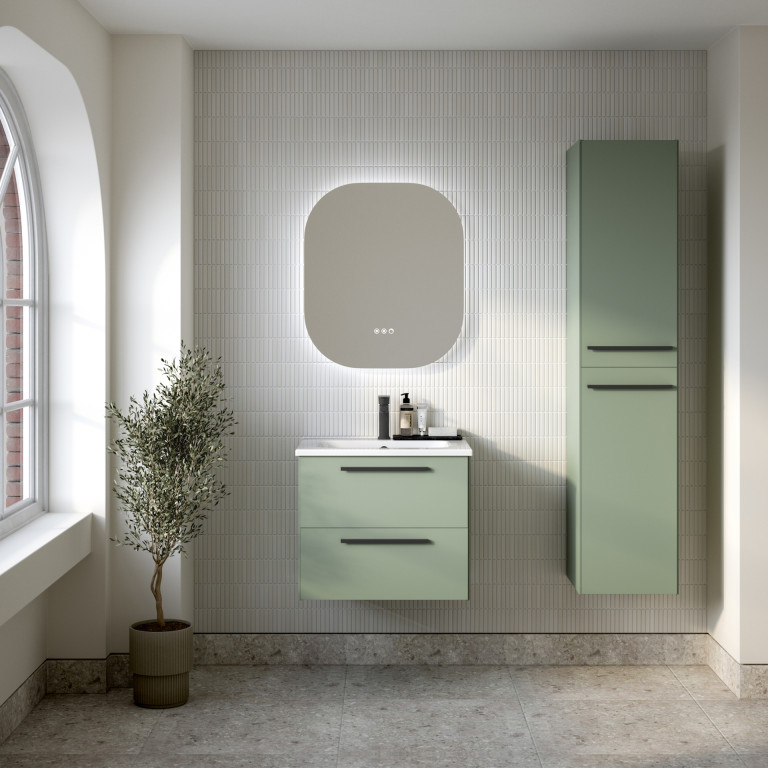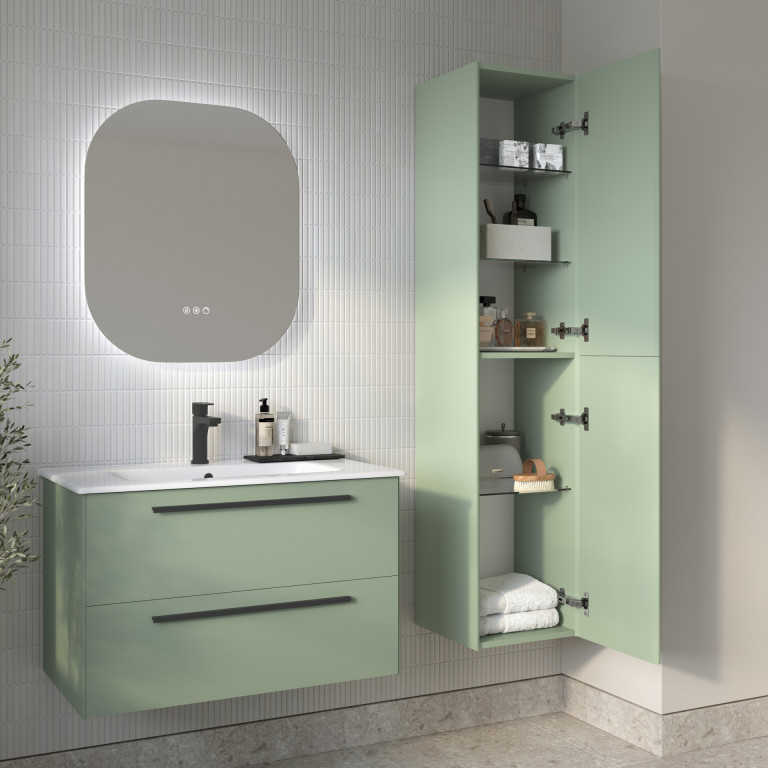 The Berwick wall unit is a versatile and stylish companion to the Berwick vanity unit. Its design is characterised by sleek angled edges, a modern slim bar handle and two doors revealing one fixed central shelf and 3 glass shelves.