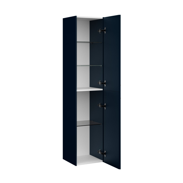 The Berwick wall unit is a versatile and stylish companion to the Berwick vanity unit. Its design is characterised by sleek angled edges, a modern slim bar handle and two doors revealing one fixed central shelf and 3 glass shelves.