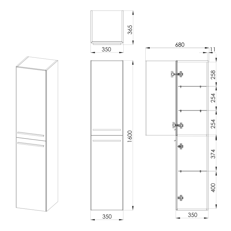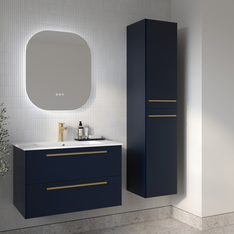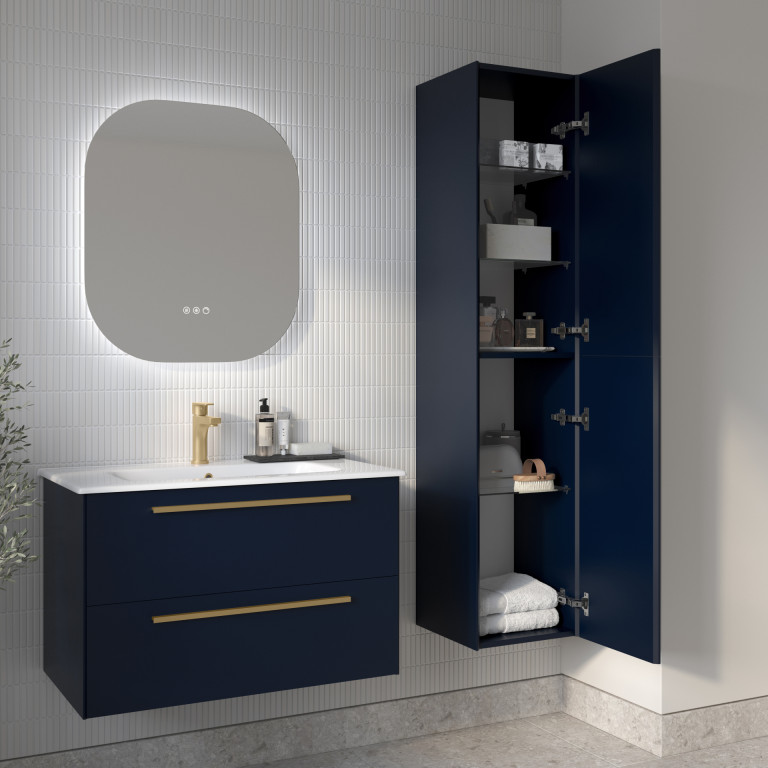 The Berwick wall unit is a versatile and stylish companion to the Berwick vanity unit. Its design is characterised by sleek angled edges, a modern slim bar handle and two doors revealing one fixed central shelf and 3 glass shelves.