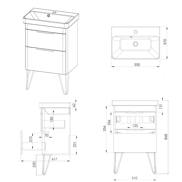 Crofton 2 Drawer Vanity 550mm with Ceramic Basin, Chrome Loop Legs and Handles -...