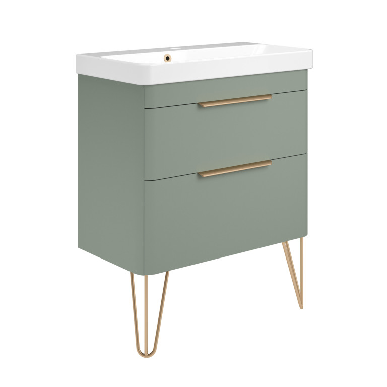 Crofton 2 Drawer Vanity 700mm with Ceramic Basin, Brushed Brass Loop Legs and Handles -...