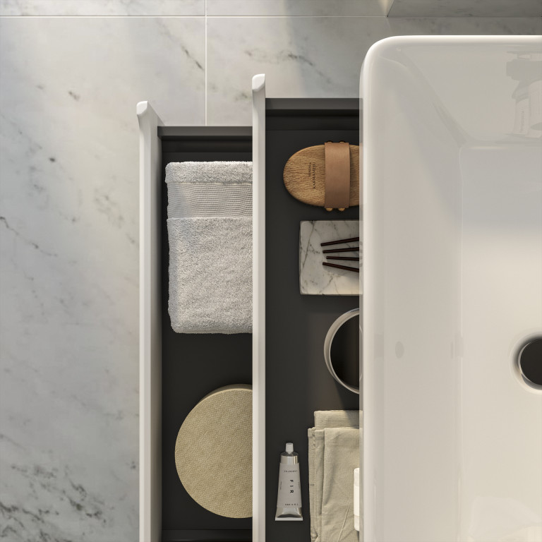 Bromont brings a contemporary feel to any bathroom with its rounded corners and integrated handles. Crafted with an emphasis on material quality, with an easy-to-clean ceramic basin, water-resistant matt finish and soft-close drawers. Bromont not only adds a touch of modern elegance to your bathroom but also prioritises functionality and quality.