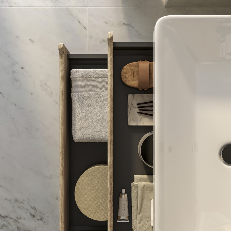 Bromont brings a contemporary feel to any bathroom with its rounded corners and integrated handles. Crafted with an emphasis on material quality, with an easy-to-clean ceramic basin, water-resistant matt finish and soft-close drawers. Bromont not only adds a touch of modern elegance to your bathroom but also prioritises functionality and quality.