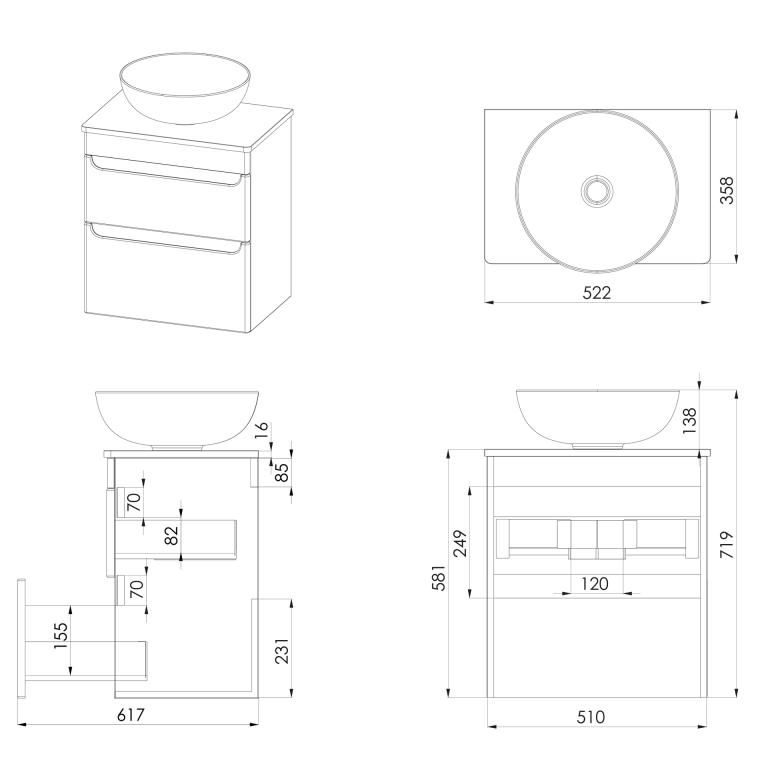 Bromont 2 Drawer Vanity 550mm with Worktop and Ceramic Sit-on Bowl - White Matt
