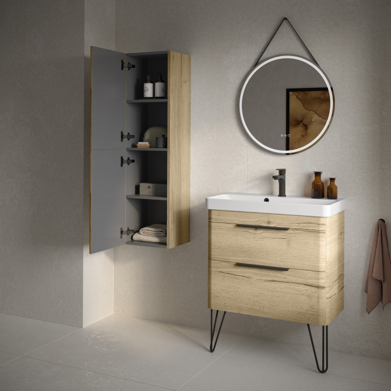 The Kenora wall unit is a contemporary and stylish companion to the Crofton and Bromont vanity units. Its design is characterised by rounded square edges, a handless design and two doors revealing three internal shelves.