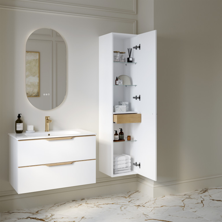 The Ottawa wall unit is a chic and modern companion to the Ottawa vanity unit. Its design is characterised by bold square edges, a full-width oak handle and one door revealing four internal shelves and an oak drawer.