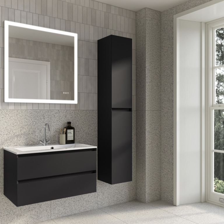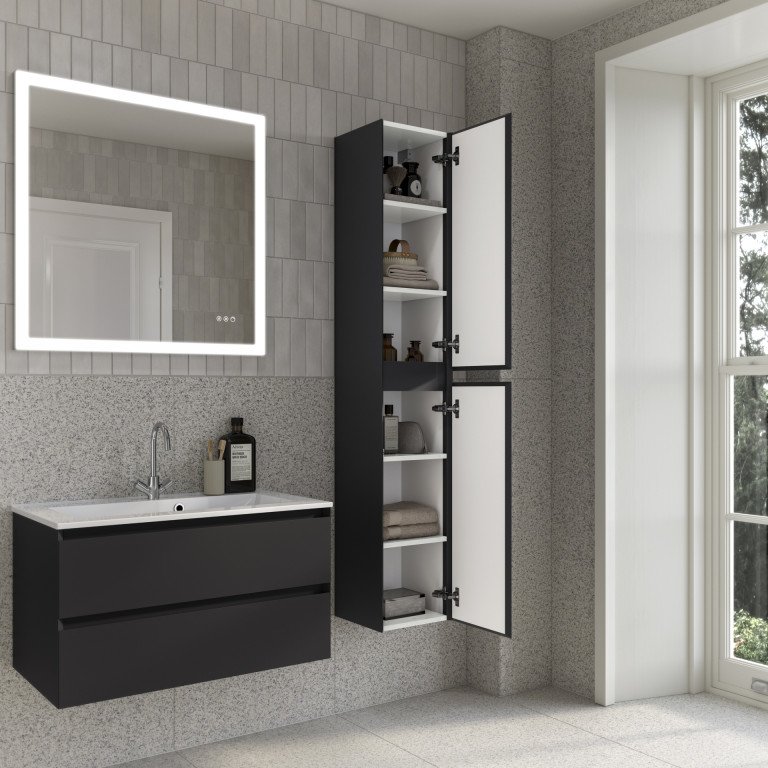 The Vernas wall unit is a chic and elegant companion to the Vernas vanity unit. Its design is characterised by a sleek profile, integrated handle and two doors revealing five fixed shelves.