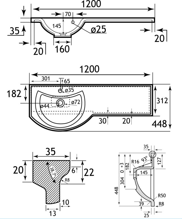- 1200mm (L) x 448mm (W) x mm (H)