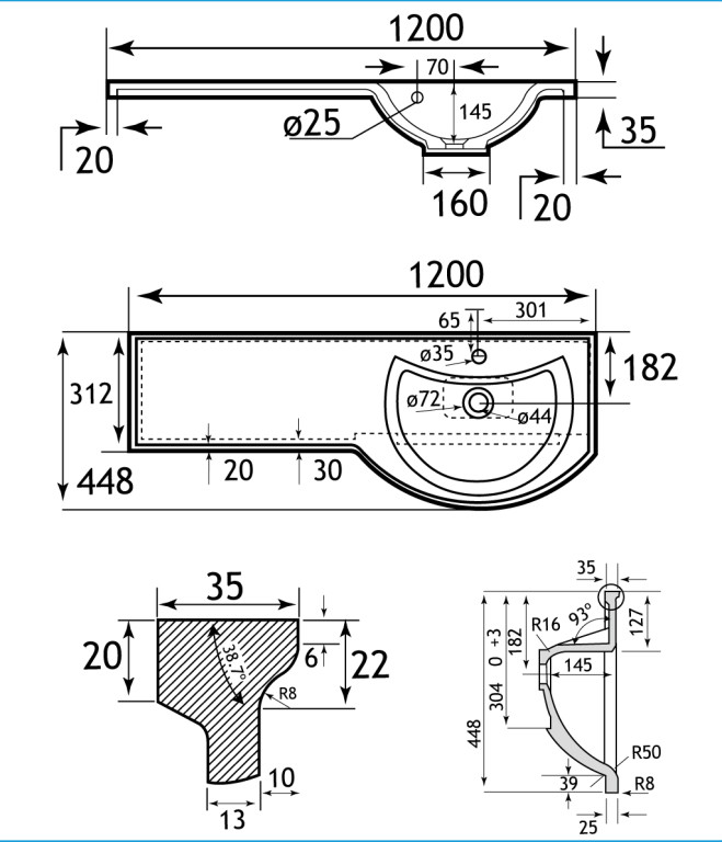 - 1200mm (L) x 448mm (W) x mm (H)
