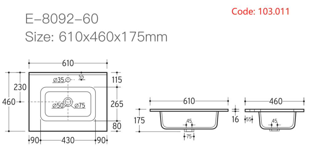 Universal 600 Basin only 1 Tap Hole - White (Vanity unit & Tap Sold Separately)
